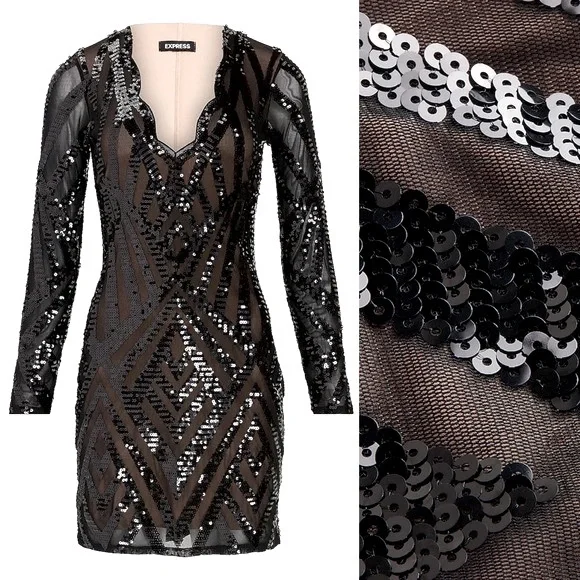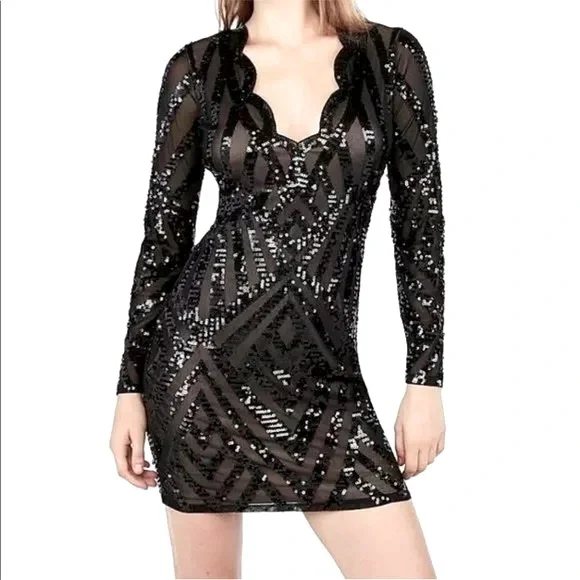 Shiny sequins, a daring deep v and stylish scallops make this bodycon dress one to remember.• High Stretch• Semi-Sheer Long Sleeves• Pull-On• Full Silky Lined• Straight Hem• Shell & Lining: 100% Polyester• Measurements: Bust: 32-38” Length: 31”Hips: 17”• Hand Wash Only❤️Thanks for Looking❤️New to Posh? Welcome! Use CodePISCESATELIER to Register & Get $10 Off Your1st order💫🌟Check Out the Rest My Closet to Bundle& Save! Open to All Reasonable Offers/Trades. Smoke & Pet Free Home💫🌟💰💰💰Bundle & Save💰💰💰20% Off of All Bundles of 3 or More Items &Discounted Shipping on All Purchases of$150 or More After 20% DiscountApplicable💰💲Sales Are FinalTag# Mugler; Carolina Herrera; Lanvin; Jovani; Herve Leger; Giorgio Armani; Gucci; Prada; Fendi; Dior; Balmain; Balenciaga; Miu Miu; Burberry; YSL; Victoria’s Secret; Vera Wang; Vivian Tam; Donna Karen; Nicole Miller; Dress The Population; Susana Monaco; Aritizia; Tory Burch; Marc Jacobs; Michael Kors; Kendra Scott; BCBGMAXAZRIA; BCBG; Kate Spade; Good American; Zara; Revolve; Anthropologie; Reformation; French Connection; Guess; bebe; Aritiza; Nasty Girl; Tilly; Cider; Wildfox; Berksha; Sister Jane; Urban Outfitters; Altar’d State; Reformation; ASTR; ASOS; REORIA; Windsor; Lulus; Fashion Nova; SHEIN; Forever 21; AX Paris; H&M Venus; Just Fab; TikTok; Instagram; Pinterest