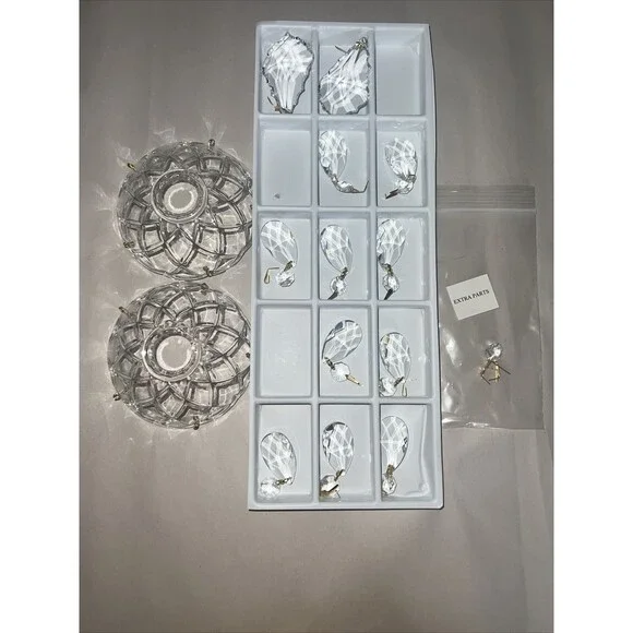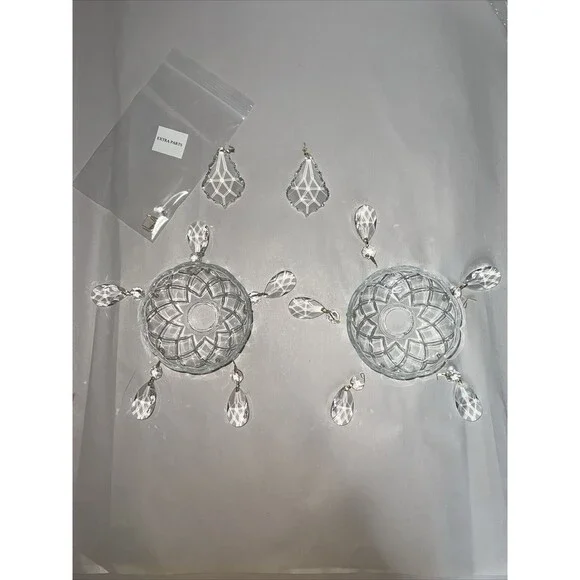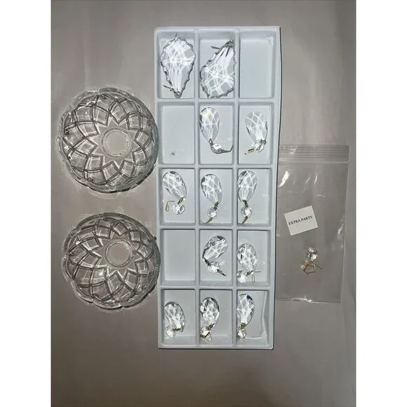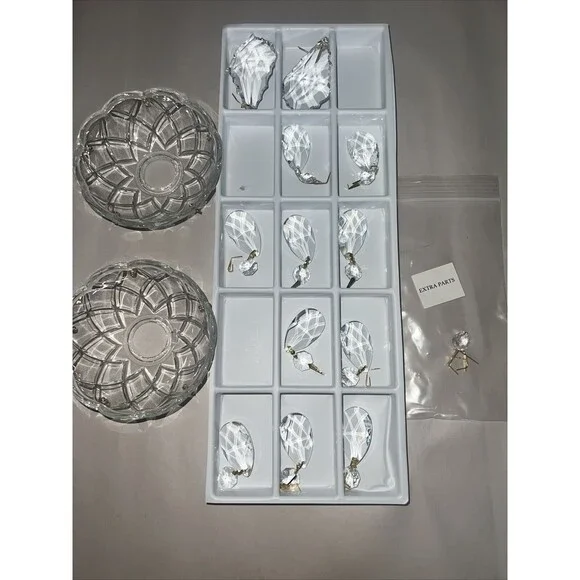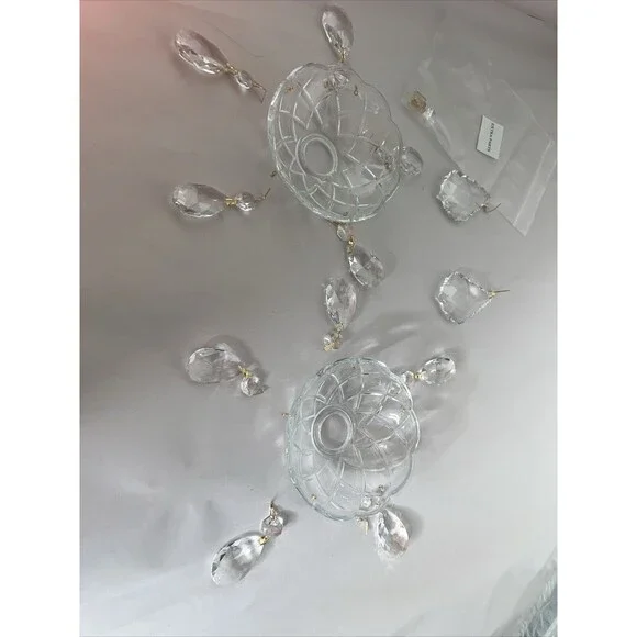 Enhance the elegance of your home with this stunning set of fine crystal bobeches. Each bobeche is embellished with five exquisite crystals that shimmer with every hint of light. Additionally, two larger crystals are included to add a touch of grandeur to your decor.Perfect for collectors, these crystal bobeches are a must-have for anyone who appreciates the beauty and sophistication of fine crystals. The intricate design and superior quality of the crystals make this set a timeless addition to your collection. Don't miss out on the opportunity to own this exceptional piece of art.Also a few extra parts in smaller bagThey say Swaroski on box so Im assuming they are. These were never opened. I had to open bags to take pics