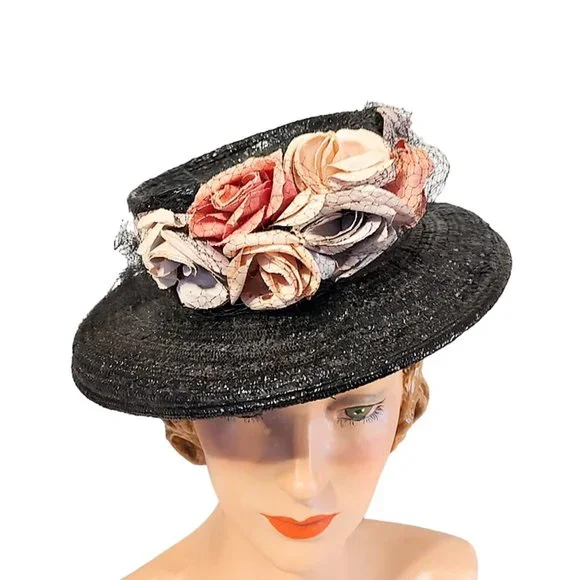 A lovely 1940s early 1950s vintage black straw boater style wide brimmed tilt hat with large roses in the front and a back band.This charming Forties hat has large paper millinery roses of dark pink, light pink, and lilac covered by black netting that circles the hat to form a bow in the back.It is a very hard shiny straw material.It has a 2 1/2" formed crown and a brim of 3" in the front.The elastic back band goes behind your head to hold it on. The inside is very wide and the hat will need to be secured to hold it in place.In very good condition with just some breaks to the netting and the elastic back band has been torn and tied/repaired.swinghome front40sfilm noirfascinatorwar yearsWW llladies hatmovie styleold hollywood style